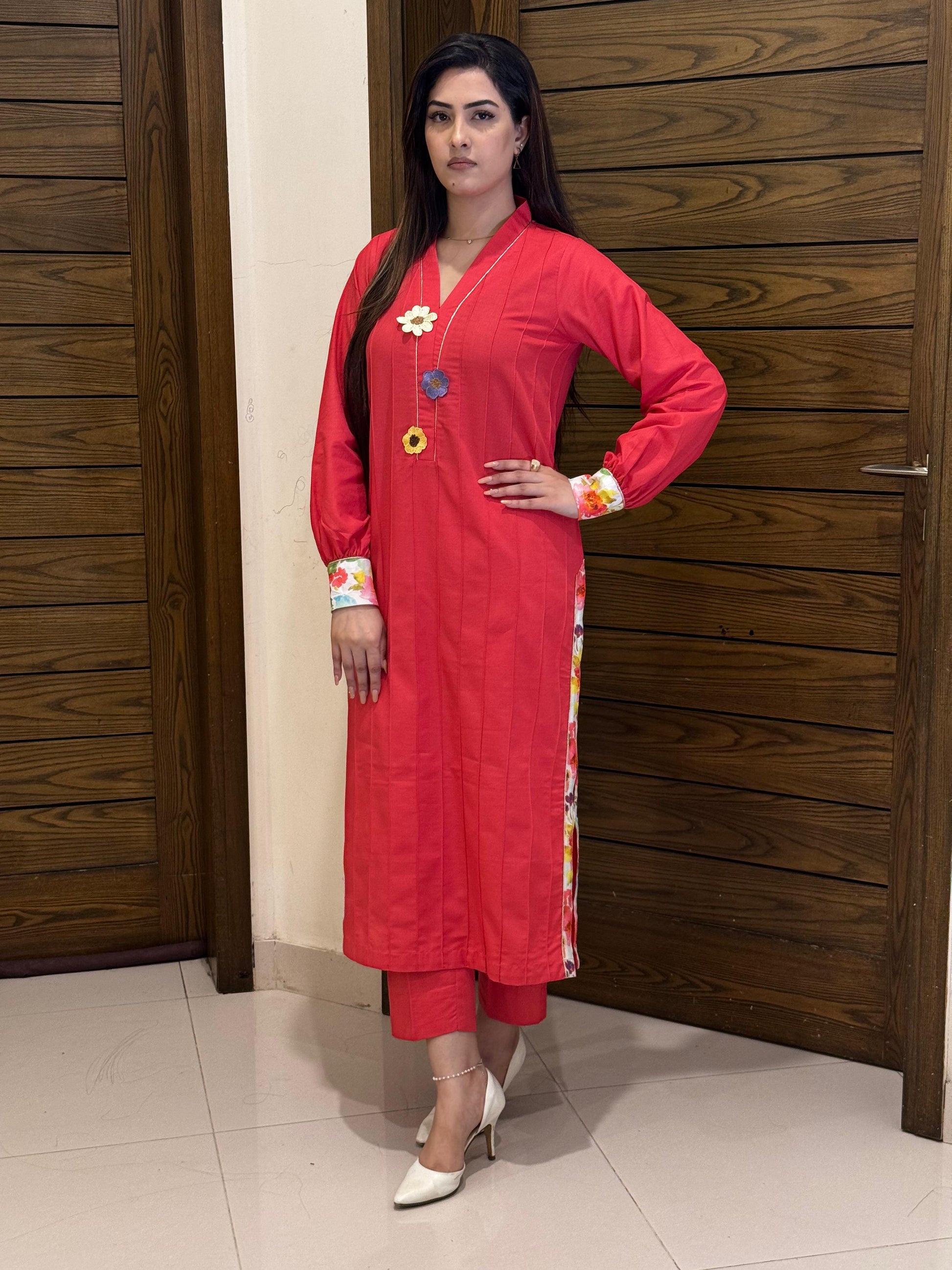 Peach 3D Flowers Plated Shirt and Trouser (STITCHED)